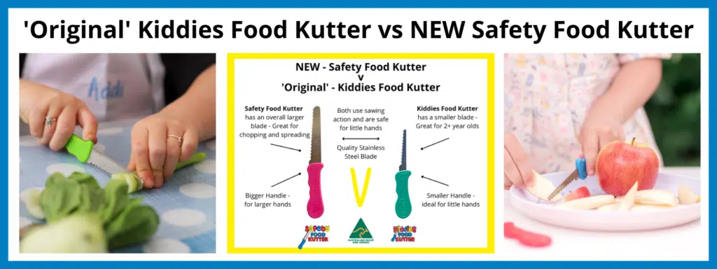 Both our Original Kiddies Food Kutter and the NEW larger Safety Food Kutter have been designed in the same way, with safety in mind. Both Safety Knives can be used by left or right handers, starting at 2 years of age, when they begin to show interest. Although our kitchen tools are safe for little ones to use, Adults supervision is always recommended when using them.